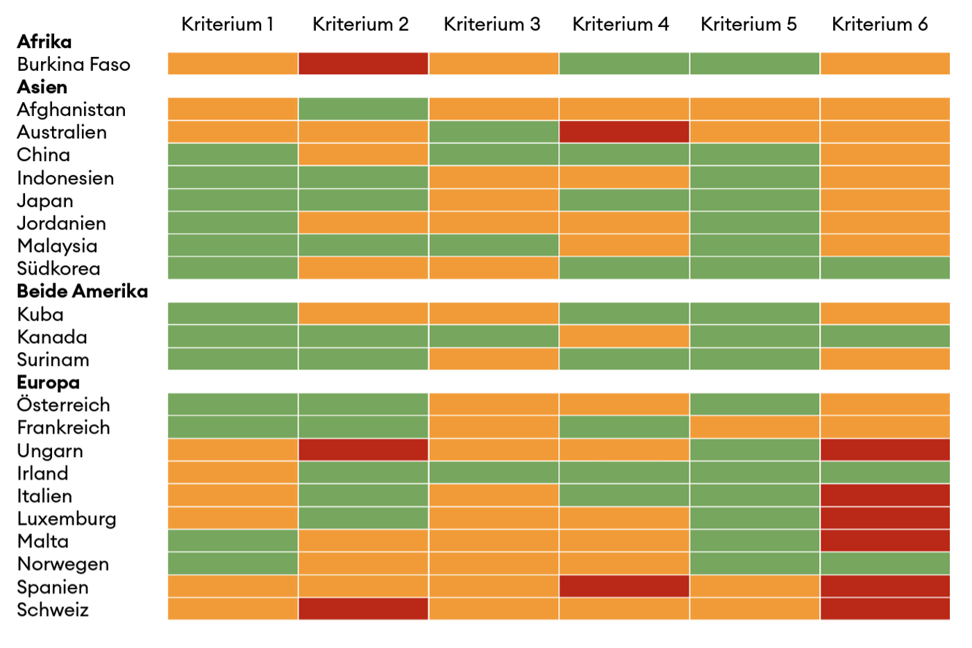 Die Studie beruht auf 59 Indikatoren. Es wurde untersucht, inwieweit der jeweilige Aktionsplan geeignet ist, den Biodiversitätsverlust wirklich zu stoppen und umzukehren. Die Mittel, die zur Umsetzung des Aktionsplans zur Verfügung stehen, und die Integration in alle Politikbereiche wurden ebenfalls unter die Lupe genommen. Das sind alles Handlungsziele, zu deren Erreichung sich die Staaten mit dem Kunming-Montreal-Biodiversitätsrahmen verpflichtet haben, auch die Schweiz. Entwickelt wurde der NBSAP Tracker vom WWF International, und es sind die gleichen Fachleute, welche die Aktionspläne der Länder beurteilten. So wird ein möglichst objektiver Vergleich sichergestellt.
