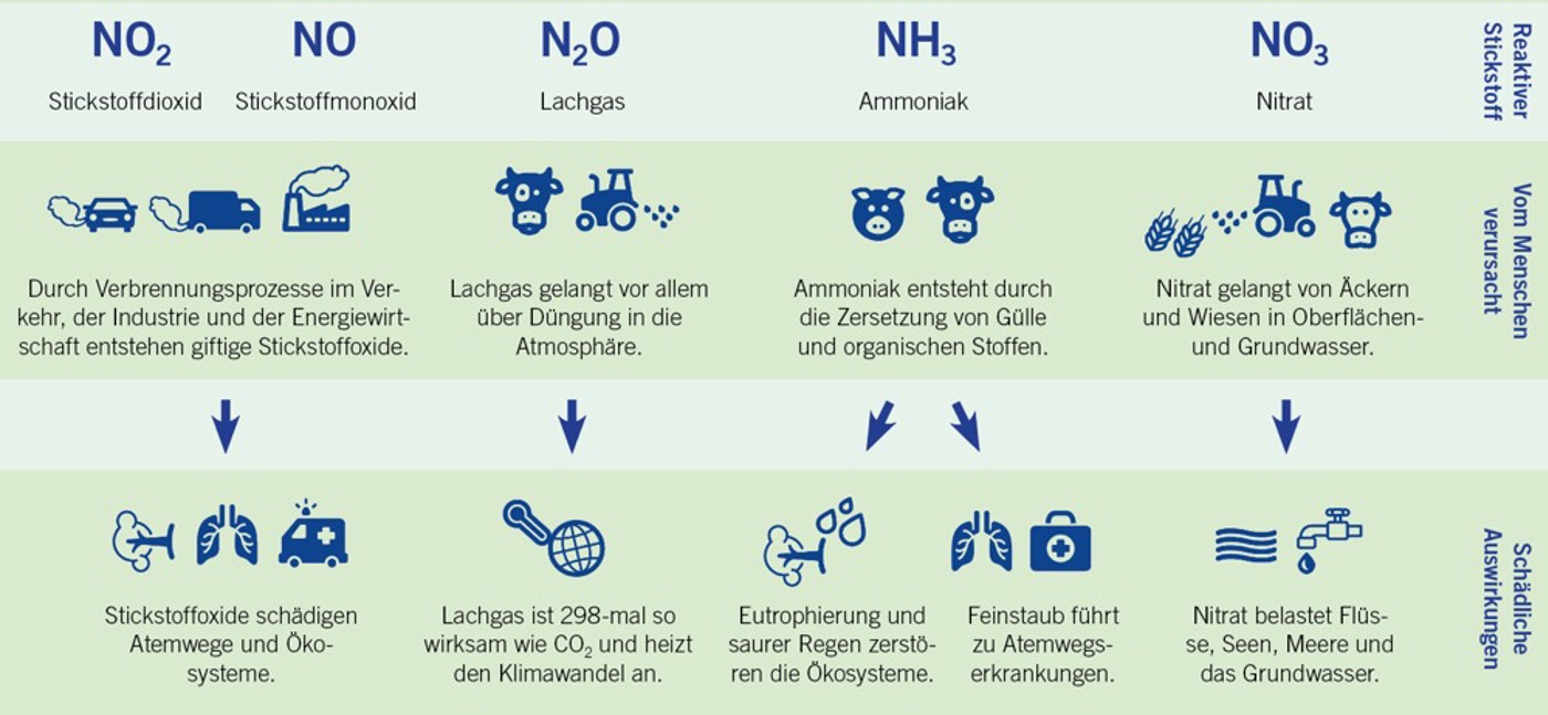 Stickstoff ist ein Grundbaustein der Natur und findet sich in Luft, Wasser und Boden, in Pflanzen und Tieren und auch im Menschen. Alle brauchen Stickstoff zum Überleben. Auf unserem Planeten überwiegt der reaktionsträge elementare Stickstoff. Doch durch menschliche Aktivitäten gelangen immer mehr reaktive Stickstoffverbindungen wie Nitrat, Ammoniak oder Stickstoffdioxid in die Umwelt. Ihr Überschuss bedeutet eine erhebliche Belastung für Mensch und Natur.