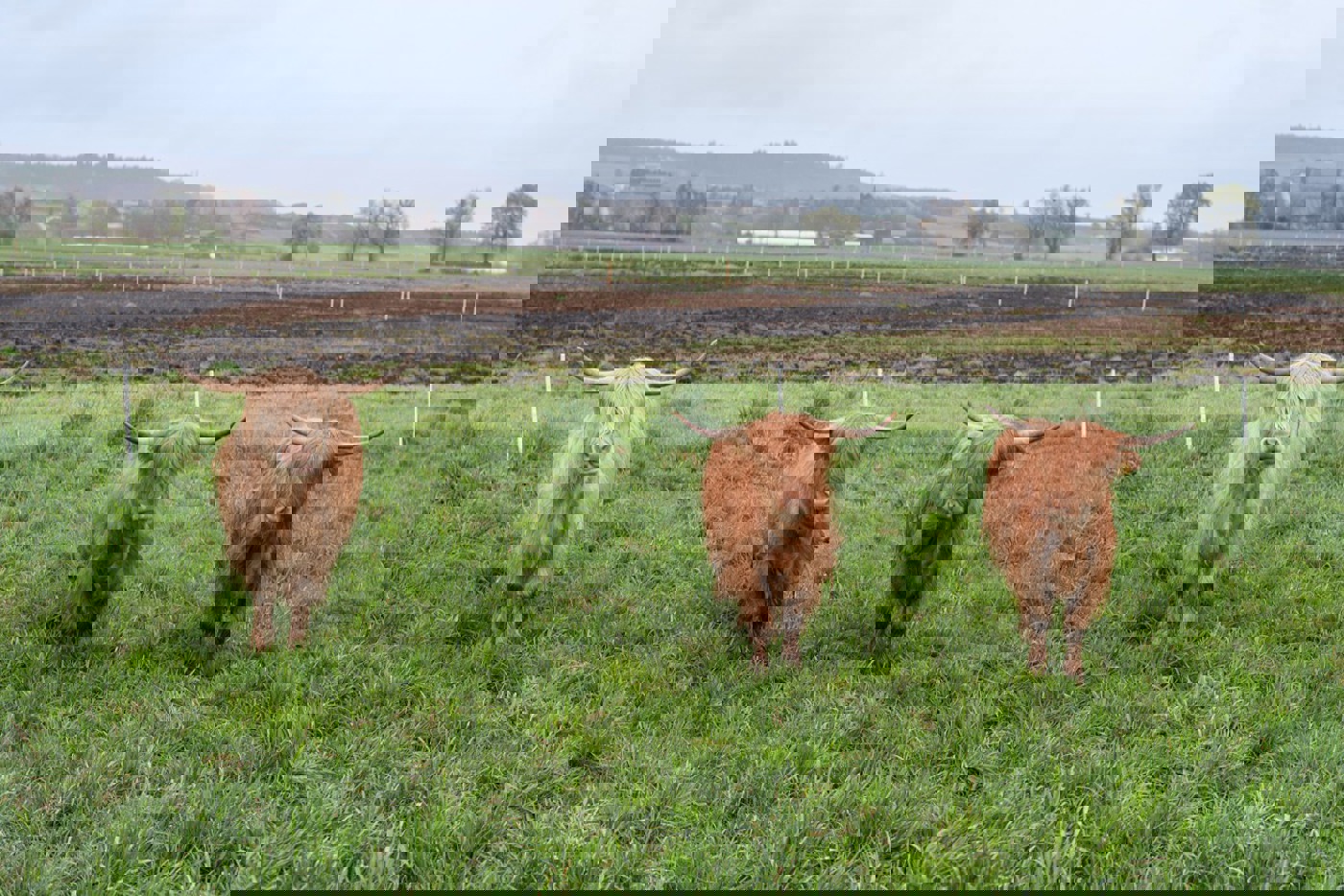 Im Grossen Moos wird erstmals in der Schweiz eine Kiebitzförderfläche mit Schottischen Hochlandrindern beweidet. © BirdLife Schweiz/Lucas Lombardo